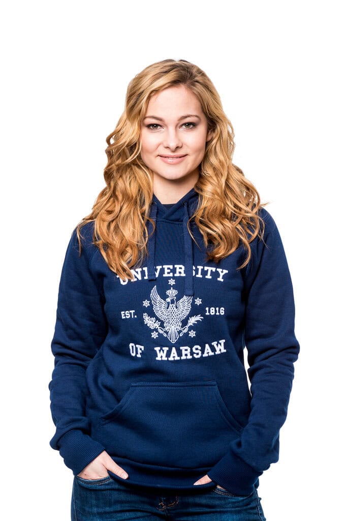 Klasyczna, granatowa bluza z kapturem i dużą kieszenią. Do wyboru dwa warianty: bluza z napisem w języku polskim lub w języku angielskim. Bluza uszyta została według jednego z dwóch zwycięskich projektów wytypowanych w ramach internetowego konkursu zorganizowanego w listopadzie 2014 roku na profilu facebookowym UW.