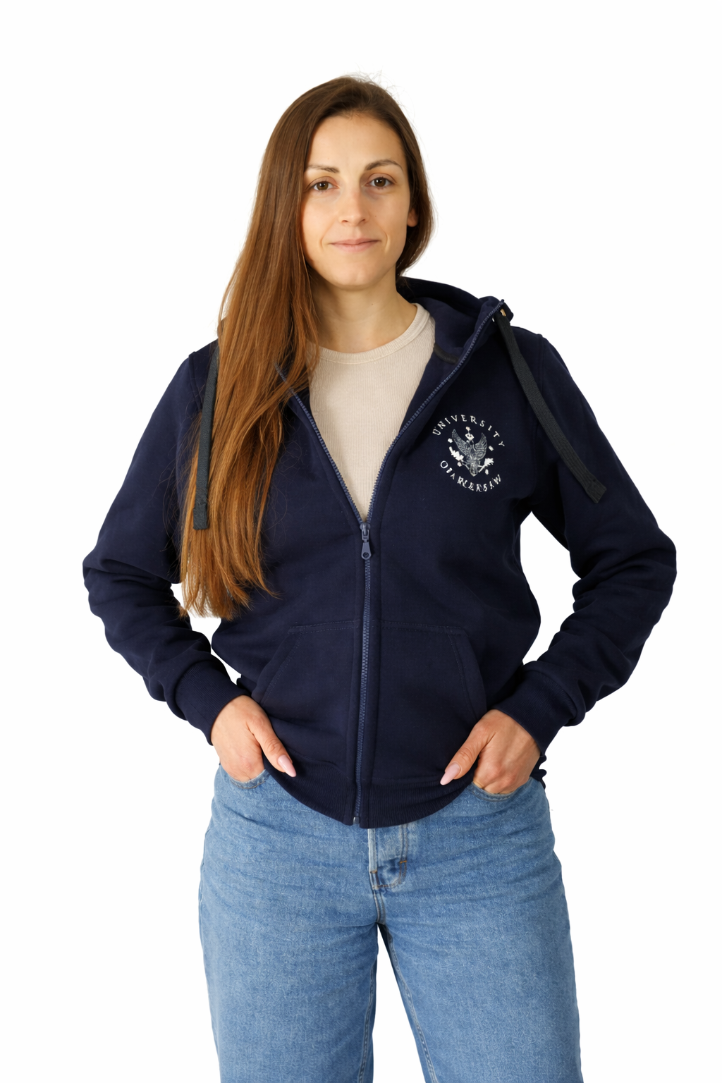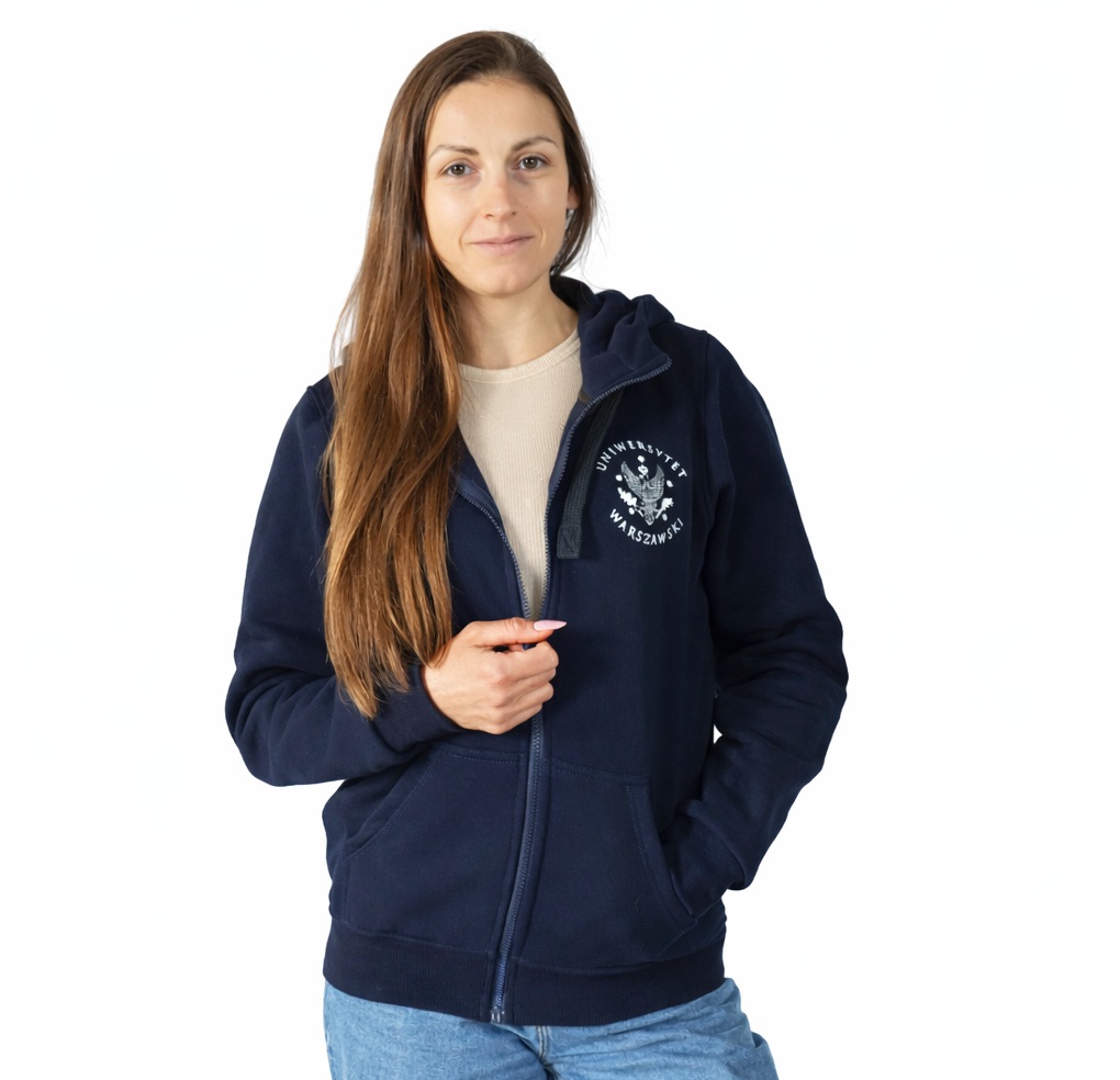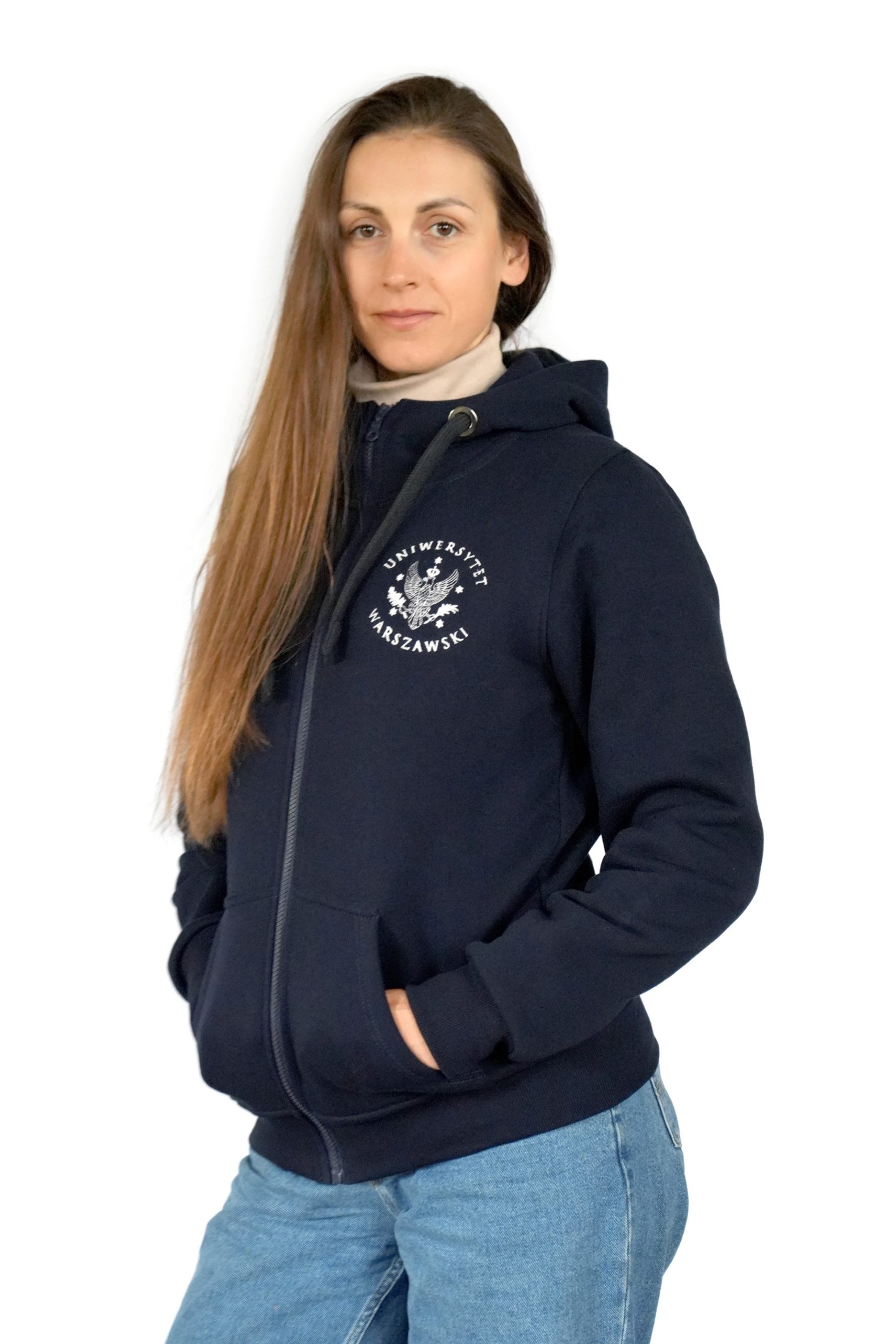 A navy blue zip-up hoodie with a hood combines comfort and classic style. Made from high-quality materials, it ensures everyday comfort—both on campus and beyond. The practical zipper makes it easy to put on, while the hood protects against cold and wind.