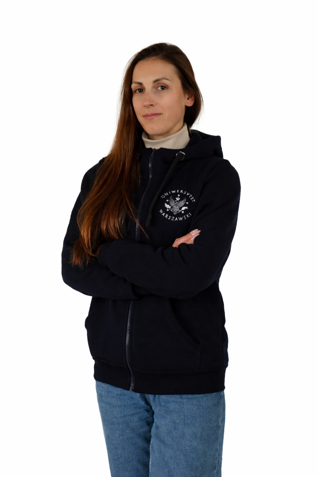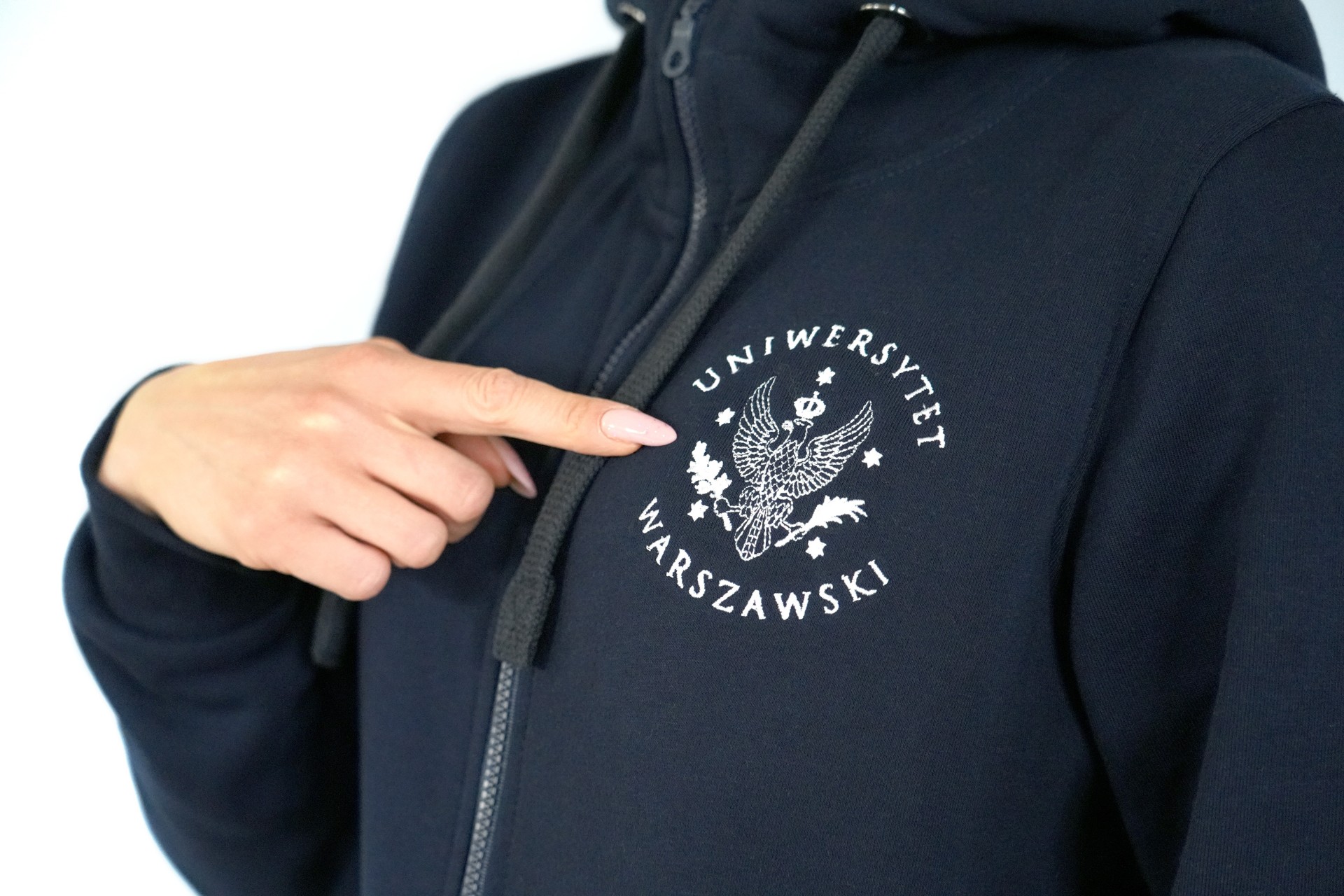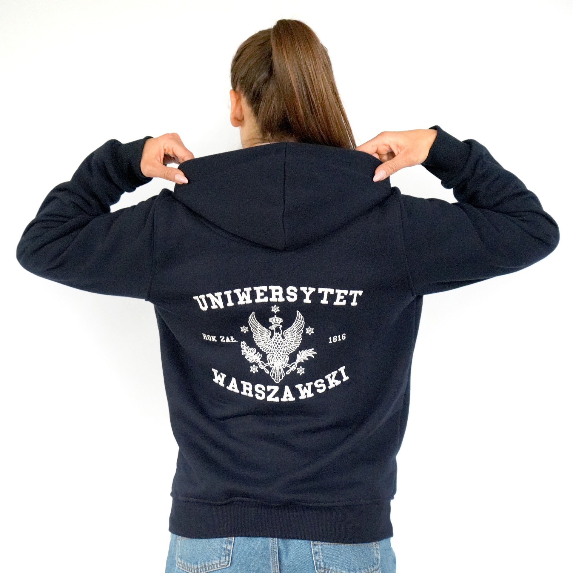 A navy blue zip-up hoodie with a hood combines comfort and classic style. Made from high-quality materials, it ensures everyday comfort—both on campus and beyond. The practical zipper makes it easy to put on, while the hood protects against cold and wind.