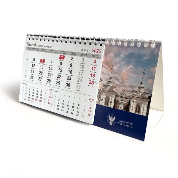 Elegancki i funkcjonalny kalendarz biurkowy w rozmiarze 22 × 12 cm, idealny do planowania dnia i organizowania czasu przez cały rok. Kalendarz wyróżnia się okładką ze zdjęciem bramy Uniwersytetu Warszawskiego oraz wysokiej jakości kredowym papierem. Zawiera pełne kalendarium na rok 2026, a jego kompaktowy format sprawia, że zmieści się na każdym biurku w domu i w pracy.